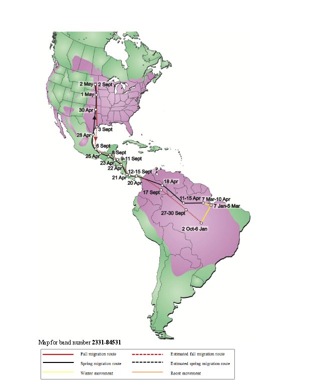 Eight after second year (ASY) Purple Martins were tracked with geolocators. Purple Martins exhibit strong site fidelity. Therefore, it is reasonable to expect the same Purple Martins to return to the colony where they raised young the previous season. While the Purple Martins are able to breed their second year, their site fidelity is not set as strong as an ASY Purple Martin. Nonetheless, a second year male (SY-M) Purple Martin was banded from a Columbia, South Dakota breeding colony in 2011 with band number 2331-84531 and was retrieved from the same Columbia, South Dakota breeding colony in 2012.
